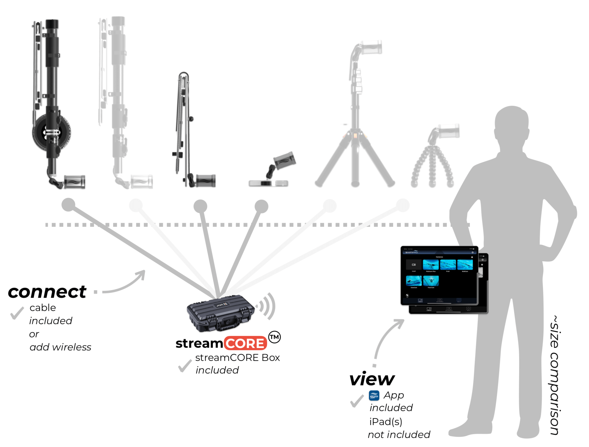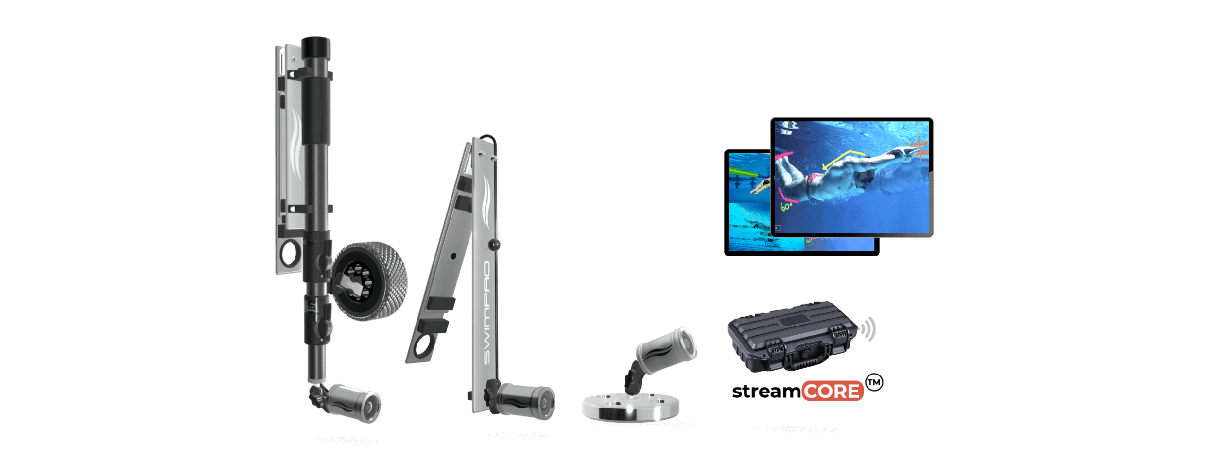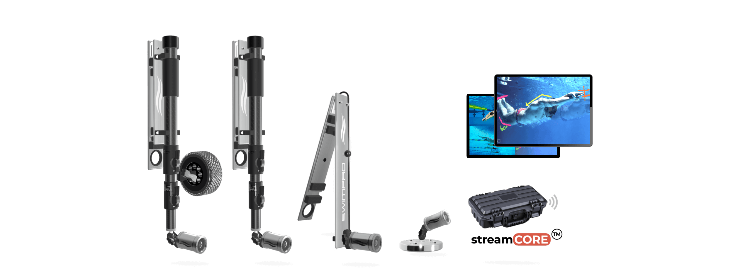 Combining our leading swimming cameras with our new powerful iPad App,  the SwimPro 6Cam package is an expression of engineering brilliance. The package includes our SwimPro Platinum Plus, ProX, WallCam, FloorCam, StartCam and ClawCam. You won’t believe it, but yes, all is included to unpack, turn on and operate… in less than 5 minutes (yes, yes, we timed it).