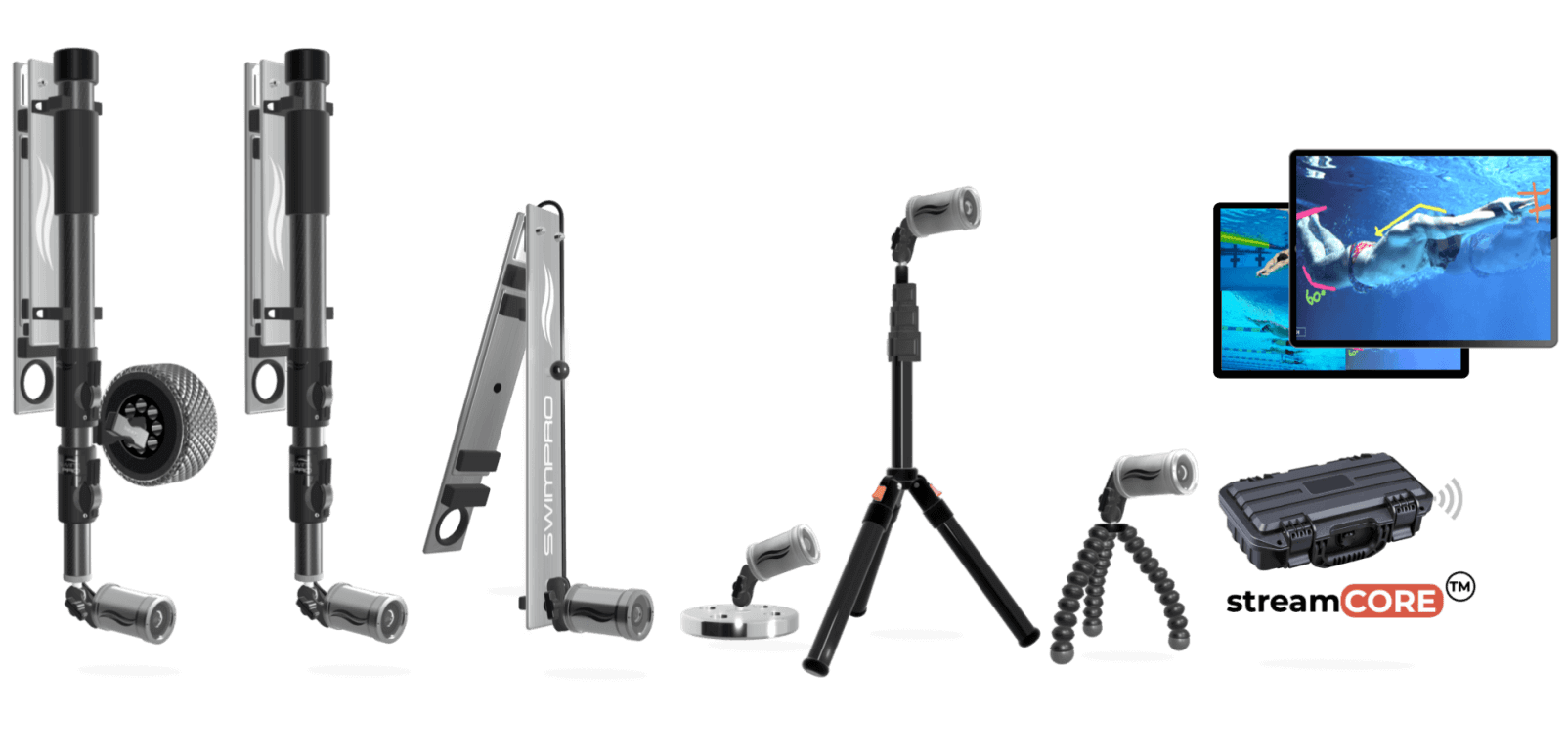 The new SwimPro 6Cam package. Pioneering the standard in swimming camera training technology.  This package, presented right here, is the gold medal swimming training package. 6 cameras – 6 custom swimming attachments – all that power right in the palm of your hands. There is no other like it. There is no other near it. This level of asset is a paramount ingredient in creating The Best of The Best!